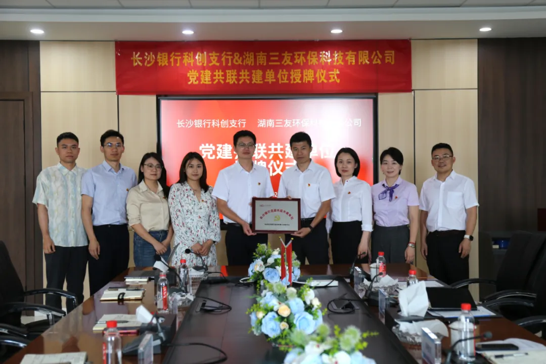 5月26日,三友环保与长沙银行科创支行成功举行党建共联共建授牌仪式。长沙银行科创支行党支部书记薛敬明,支部委员张如、王莹及业务二部负责人刘超,三友环保党支部书记、财务总监胡有才,总经办主任肖惠丹、支部委员等出席会议。