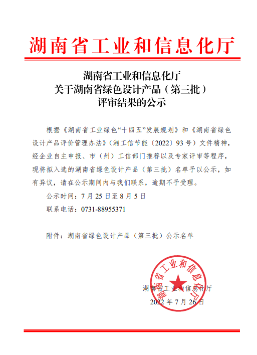近日,湖南省工业和信息厅对湖南省绿色设计产品名单进行公示,三友环保水处理用复合粉末载体、生物载体分离回收系统两款产品名列其中,获“绿色设计产品”称号。