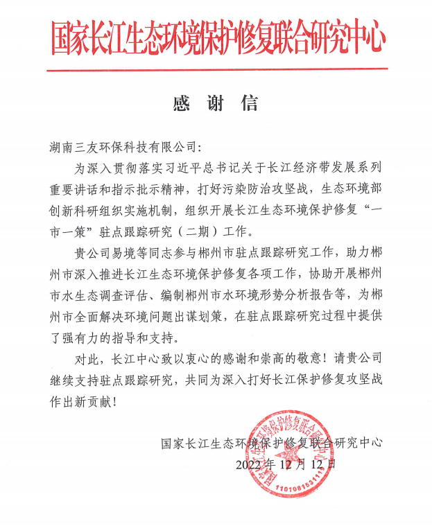 这封来自于国家长江生态环境保护修复联合研究中心的感谢信,对三友环保参与到郴州市驻点跟踪研究工作之中,为全面改善环境质量出谋划策,在驻点跟踪研究过程中提供的指导和支持表示了感谢。