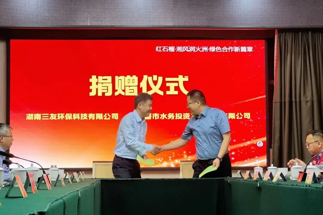 在本次活动期间,三友环保与吐鲁番市水务投资发展集团签署战略合作协议,并向吐鲁番市水务投资发展集团捐赠指挥控制系统平台。此次签约与捐赠不仅标志着双方在污水处理、水环境保护等领域合作迈出坚实一步,更展现了三友环保以技术赋能吐鲁番生态建设的决心,未来双方将继续深化合作,在智慧水务、生态修复等领域持续发力,共同绘就“湘吐同心”合作新蓝图。