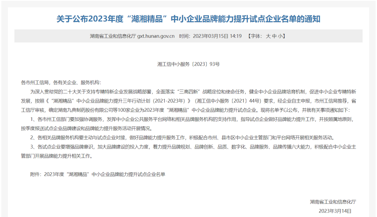 为深入实施“三高四新”战略,全面推进中小企业品牌提升工程,促进中小企业“专精特新”发展,湖南省工信厅出台了《“湖湘精品”中小企业品牌能力提升三年行动计划(2021-2023年)》,旨在筛选一批基础条件好、发展潜力大、市场前景广阔的企业设为试点,建立“湖湘精品”培育梯队,打造一批“记得住、叫得响、走得出”的“湖湘精品”品牌。