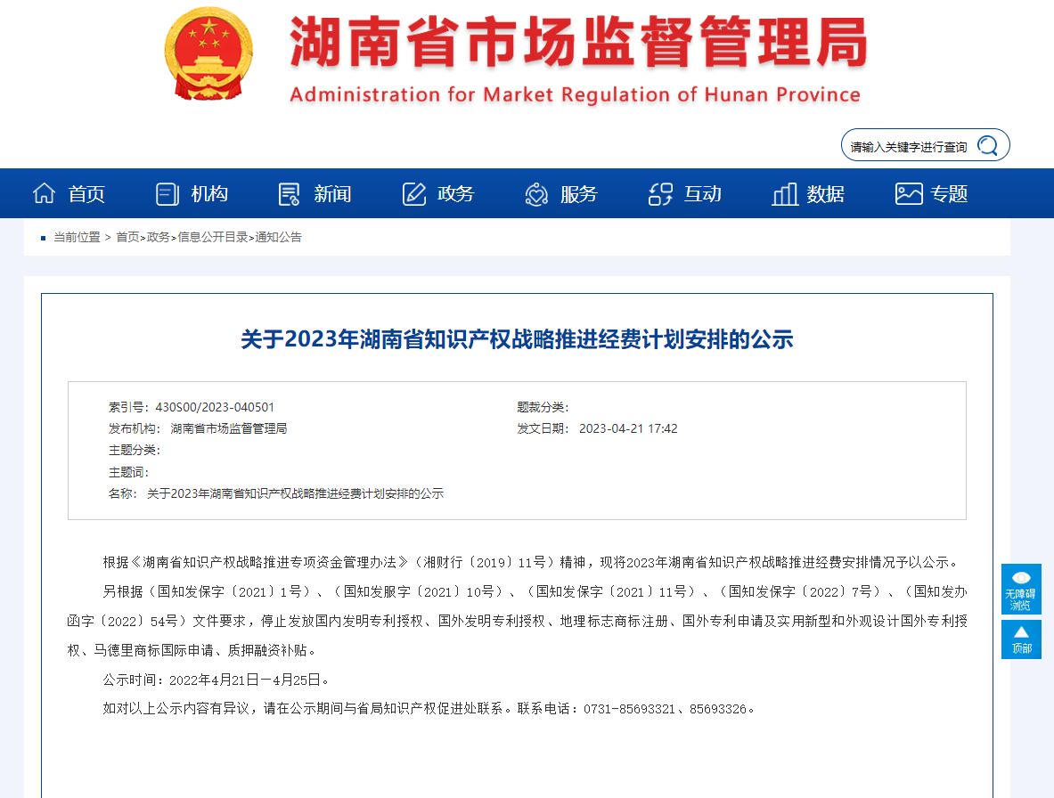 据了解,为全面落实“三高四新”战略定位和使命任务,加快知识产权强省构建,全面提升知识产权创造质量、保护效果、运用效益、管理水平和服务能力,湖南省知识产权局、湖南省财政厅启动2023年度知识产权战略实施专项项目,积极推动湖南省知识产权工作高质量发展。