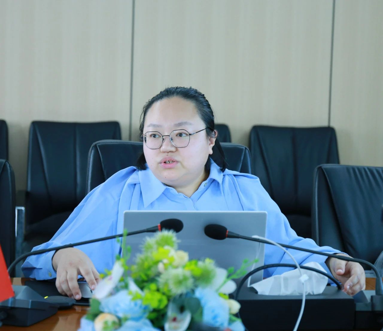 (图为三友环保研发经理牟悦介绍公司情况)