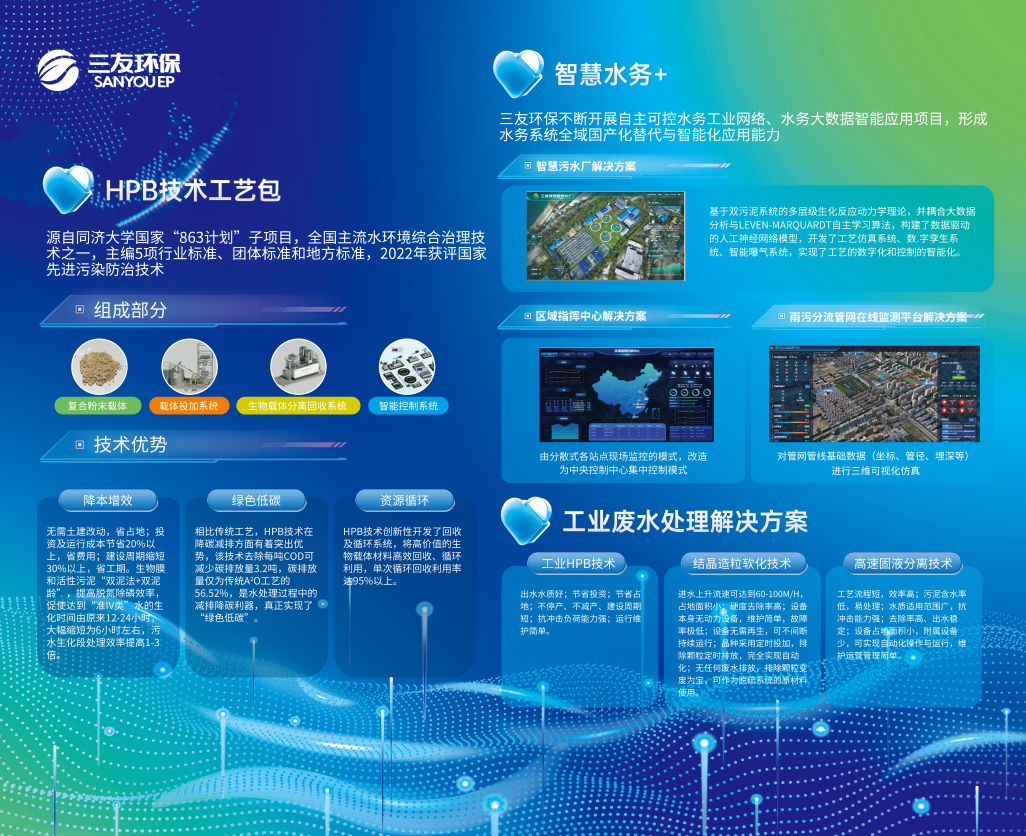 展会现场,三友环保围绕业务版块、核心技术、研发实力、项目案例等方面进行集中展示,对HPB工艺包、智慧水务+、工业废水处理解决方案三大技术路径进行了具体呈现,全方位展示了公司在“双碳”目标下推动水环境综合治理领域技术化、高效化与低碳化发展取得的创新成果,吸引了众多业内人士前来了解咨询、交流洽谈。
