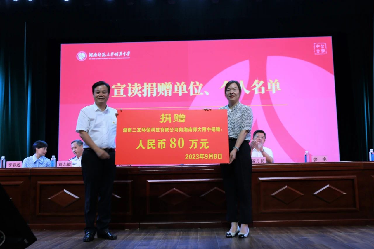 取之于社会,用之于社会,三友环保始终认为,一个伟大的企业,不仅仅需要做到给行业、给客户提供优质的产品与服务,更重要的是要竭尽全力使这个世界变得更美好,而教育就是最好的礼物。为回馈社会,振兴国家教育事业,三友环保特于湖南师大附中设立“三友心育专项基金”,并捐赠80万元,用于奖励优秀教师与学生,扶助贫困教师与学生,助力湖南师大附中更好践行“为党育人、为国育才”的使命。