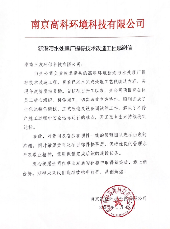 1月16日,三友环保新港污水处理厂提标技术改造工程项目喜获业主单位南京高科环境有限公司的一封感谢信。信中,不仅对三友环保项目团队攻坚克难、高效推进项目进程的成绩表示充分肯定,还对HPB技术不停产改造及出水持续稳定的成效及优势表示了高度认可。