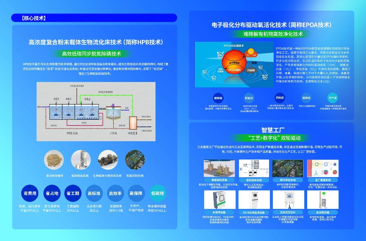 在高效低碳同步脱氮除磷领域,三友环保自主创新HPB技术,以“复合粉末载体、载体投加系统、生物载体分离回收系统、智能控制系统”为核心,凭借“省费用、省占地、省工期、高效率、高标准、高保障、低碳排”多项优势,不仅可以在不停水不停产的情况下提升处理水量,还能保证出水水质,让COD及TN的处理效果得到显著提升;在难降解有机物高效净化领域,三友环保研发EPOA技术,打破了传统高级氧化技术的技术瓶颈,具有耐酸碱、药耗低、不产泥、耐盐分、能耗低等优势,可实现难降解有机物的分解、氧化,进一步去除有机污染;在智慧运营领域,三友环保打造智慧工厂解决方案,通过先进的工业互联网技术,实现生产数据全采集,并且通过挖掘数据价值,实现生产过程可视、可管、可控,不断提升生产效率和产品质量,持续优化生产工艺,让工厂更智慧。