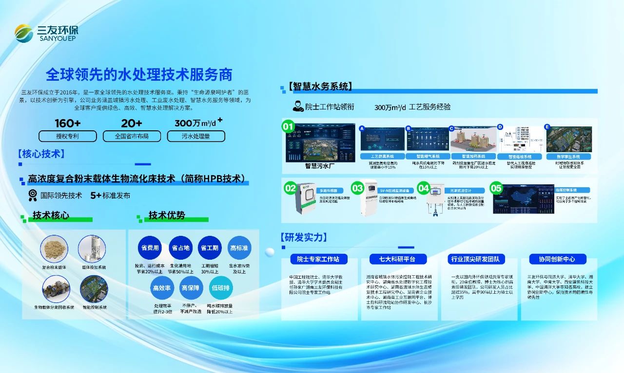 据三友环保技术负责人田云介绍,三友环保自2016年成立,便始终深耕污水处理领域,以技术创新为引擎,锚定城镇污水处理、工业废水治理、智慧水务服务三大业务服务领域,以多项国际领先的技术为全球客户提供绿色、高效、智慧水处理解决方案。目前,依托院士工作站及七大科研平台的强大研发实力,三友环保自主创新的HPB技术已被多位专家鉴定为国际领先水平,其“省费用、省占地、省工期、高效率、高标准、高保障、低碳排”的多项优势,不仅可以在不停水不停产的情况下实现城镇污水处理水质、水量的双提升,还可以节省投资运行成本20%以上,节省生化池用地50%以上,节省工期30%以上,且碳排放量仅为传统AAO工艺的56.52%,同步实现投资省、占地面积少、建设周期短、运行成本低等经济、社会效益。与此同时,在智慧水务领域,三友环保打造智慧工厂解决方案,可通过先进的工业互联网技术,实现生产数据全采集,并且通过挖掘数据价值,实现生产过程可视、可管、可控,不断提升生产效率和产品质量,持续优化生产工艺,让工厂更智慧。