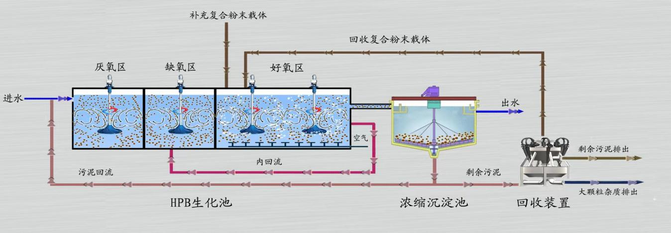 HPB技术基于污水生物处理的技术原理,通过向生化池中投加复合粉末载体,提高生物池混合液浓度的同时,构建了悬浮生长和附着生长“双泥”共生的流化床系统;并通过污泥浓缩分离单元、复合粉末载体回收单元,实现了“双泥龄”,强化了生物脱氮除磷效率。