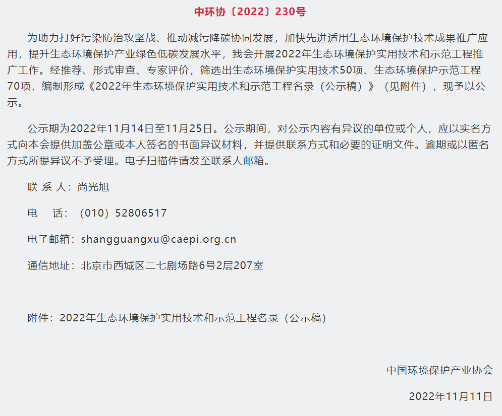 (图为《2022年生态环境保护实用技术和示范工程名录》公示)